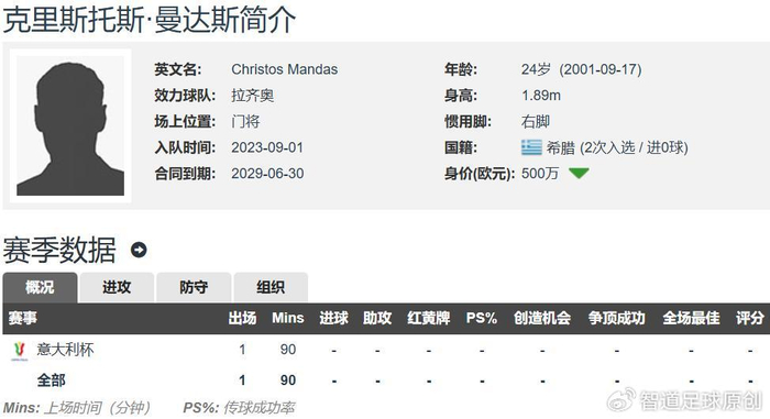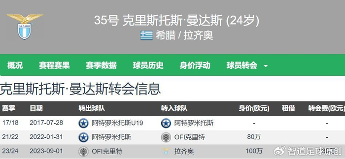 曼达斯于2023年夏窗以130万欧元的转会费加盟拉齐奥,至今蓝鹰生涯出场33次,取得13次零封,拉齐奥出售曼达斯也能小赚一大笔转会费。